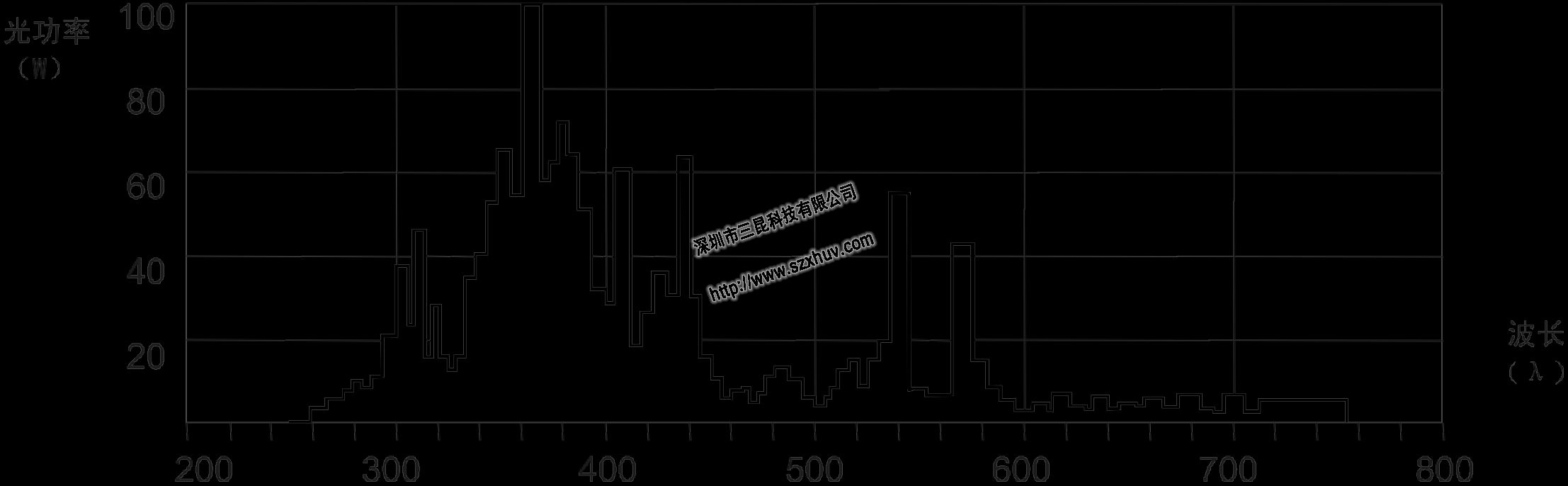 高壓汞燈可以產(chǎn)生輻射強(qiáng)烈的310nm 、365nm、410nm 等波長的特征紫外光(UV)、可見光及紅外光(IR)其中365nm為主峰的波長是世界各國常用的、用于固化干燥的波段(以下稱謂的"UV燈"即指365nm的高壓汞燈)。